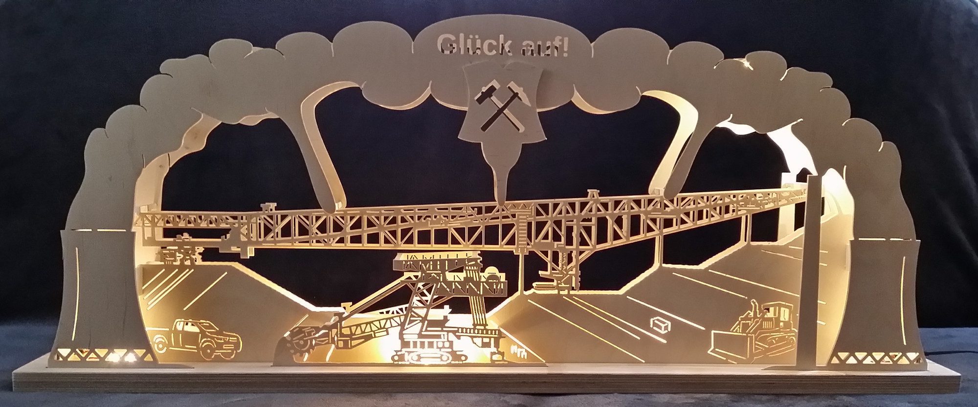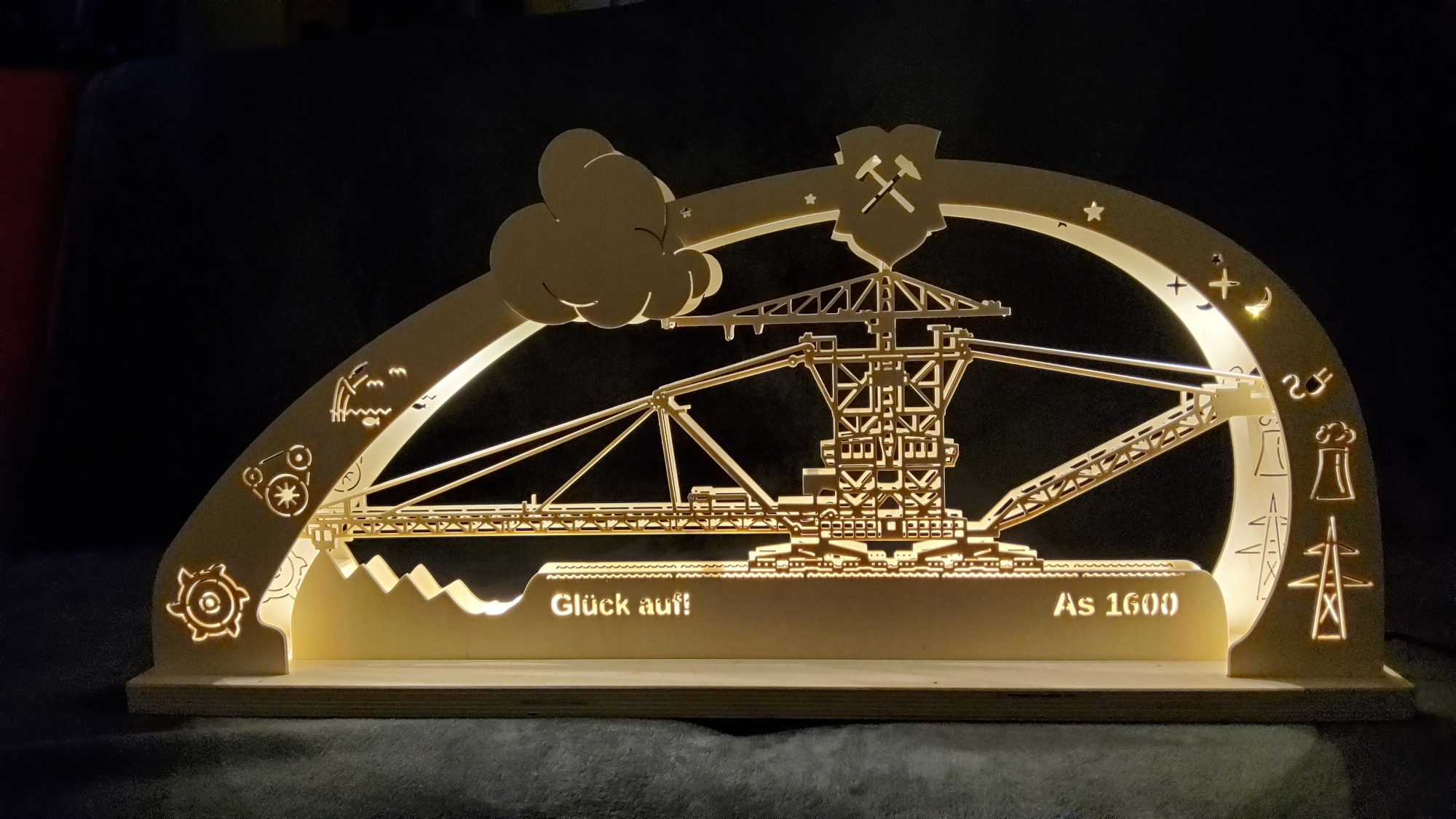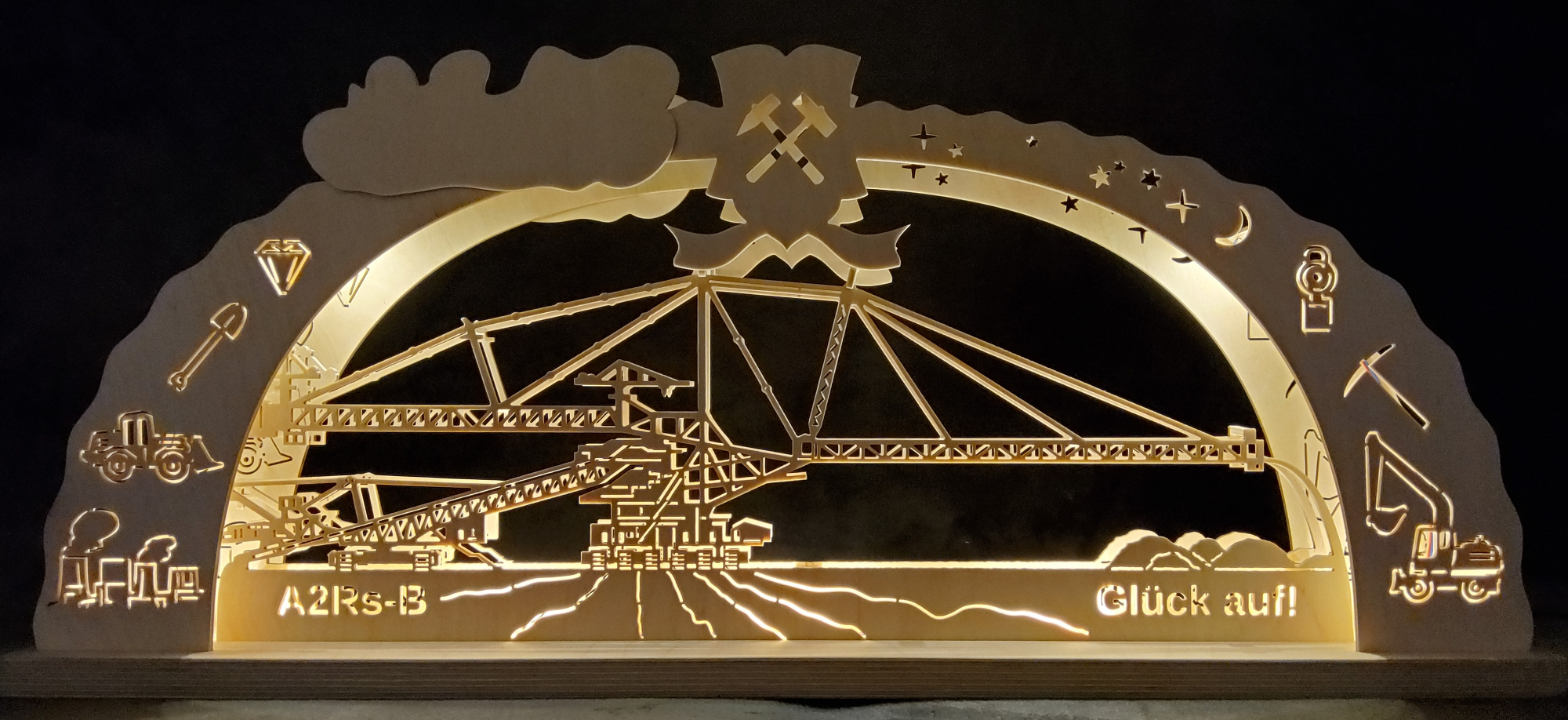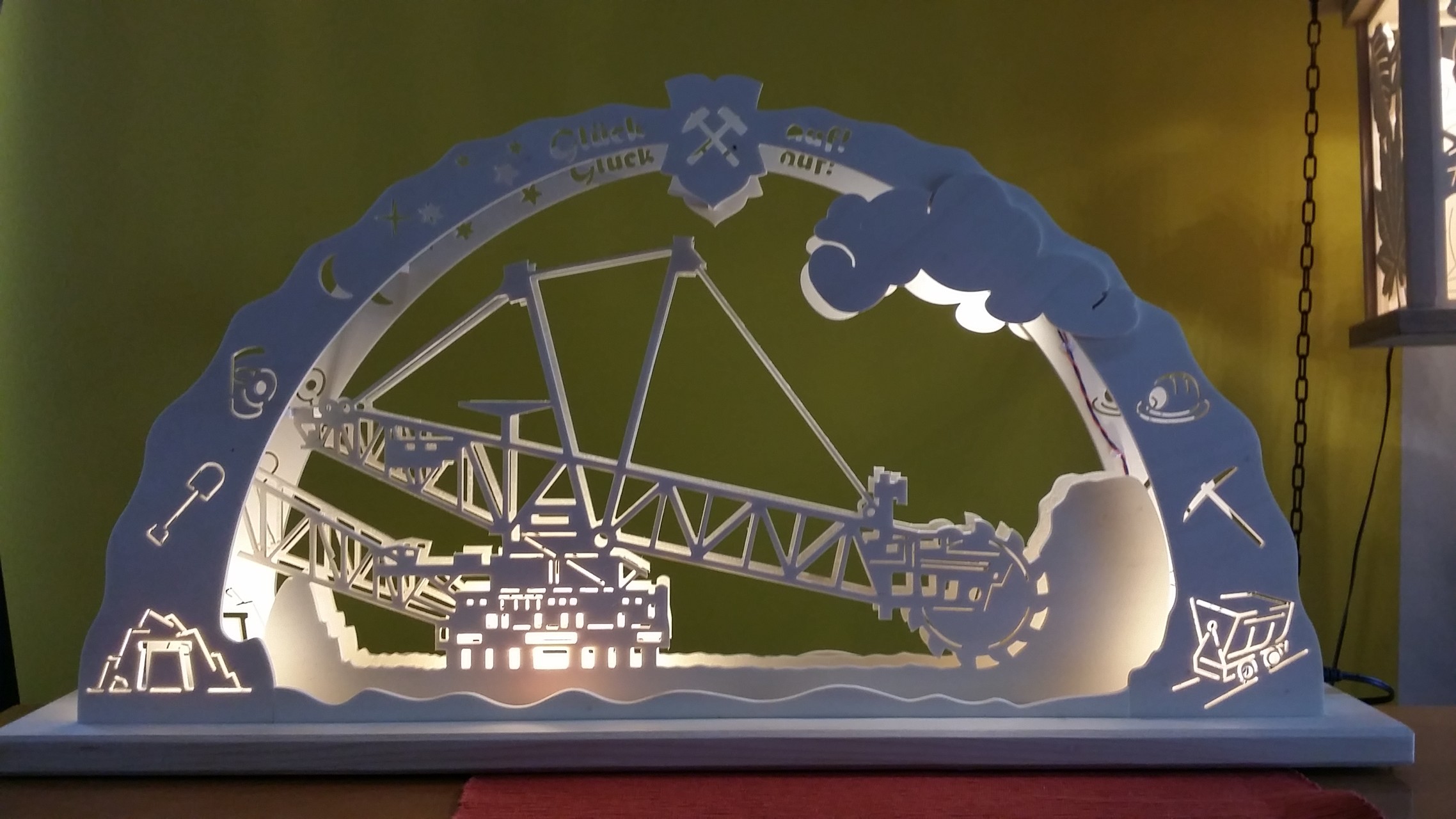 Die hier vorgestellten Schwibbögen handeln thematisch von der Lausitzer Bergbautradition und bilden Tagebau Großgeräte ab. Sie sind handwerklich solide aus hochwertigen Materialien, wie 4 mm Birkensperrholz und Birken Multiplexholz gefertigt und mit einfacher Massen- bzw. billiger Laserproduktion oder Pappelsperrholz nicht vergleichbar. Alle Teile (auch die kleinsten) sind handgeschliffen und werden solide bis zu 1 cm tief eingeklebt. Dadurch besitzen die Schwibbögen eine hohe Festig- und Langlebigkeit. Die LED Beleuchtung erfolgt mittels warmweißer LED und ist von der Modulanzahl her auf bestmögliche Wirkung abgestimmt und per Hand verlötet. Größere Bögen ab 75 cm Breite besitzen rechts und links Stromanschlüsse für die mitgelieferten Netzteile. Alles in allem erwerben Sie hiermit eine solide Lausitzer Handwerkskunst.