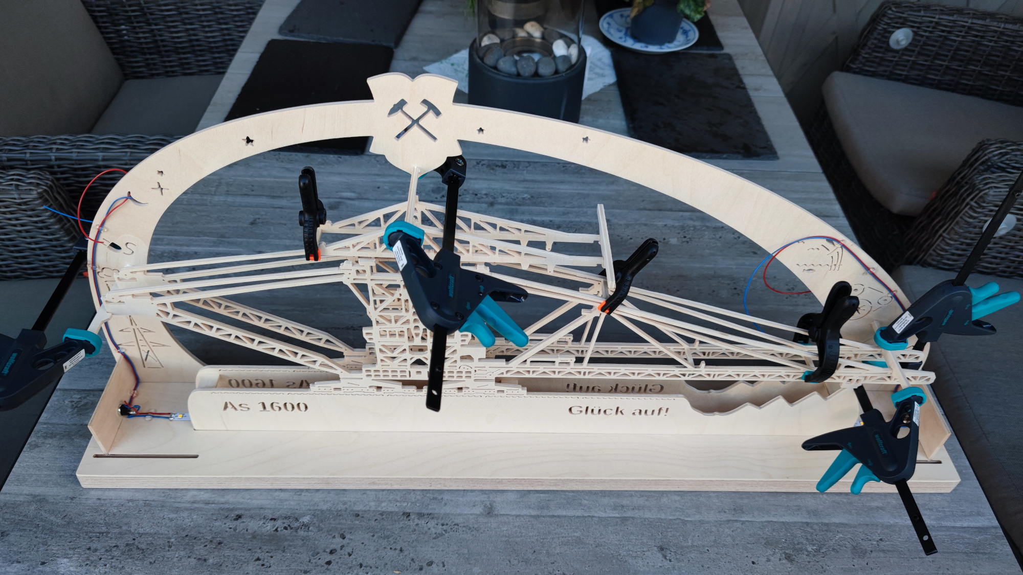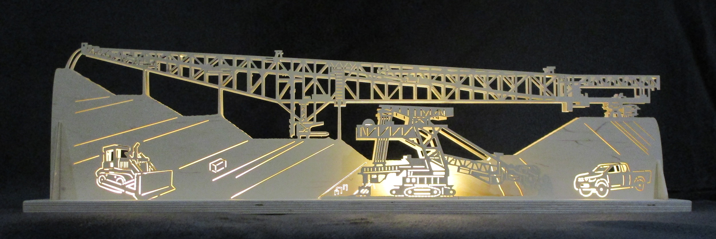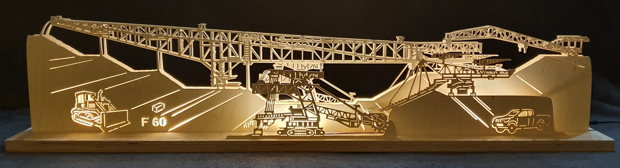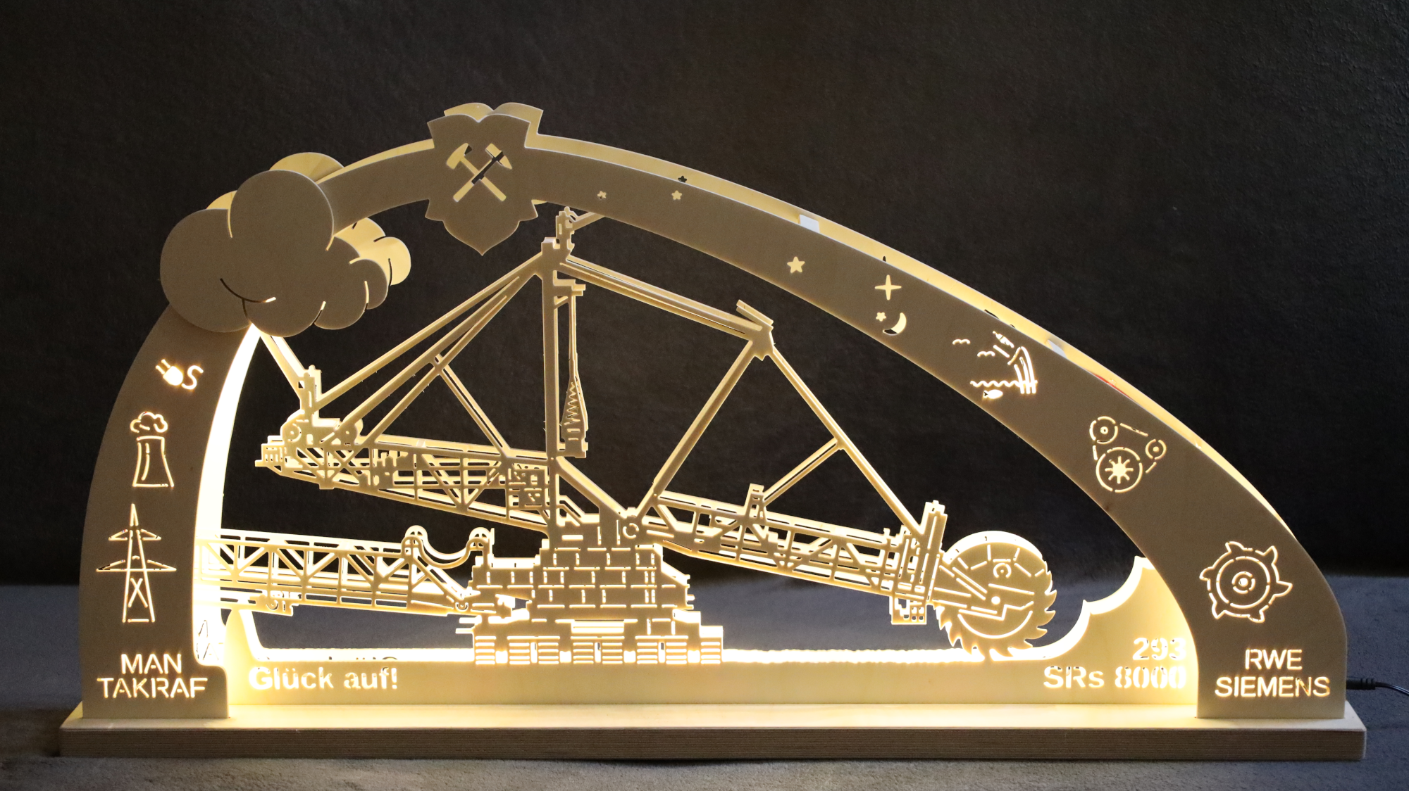 Die hier vorgestellten Schwibbögen handeln thematisch von der Lausitzer Bergbautradition und bilden Tagebau Großgeräte ab. Sie sind handwerklich solide aus hochwertigen Materialien, wie 4 mm Birkensperrholz und Birken Multiplexholz gefertigt und mit einfacher Massen- bzw. billiger Laserproduktion oder Pappelsperrholz nicht vergleichbar. Alle Teile (auch die kleinsten) sind handgeschliffen und werden solide bis zu 1 cm tief eingeklebt. Dadurch besitzen die Schwibbögen eine hohe Festig- und Langlebigkeit. Die LED Beleuchtung erfolgt mittels warmweißer LED und ist von der Modulanzahl her auf bestmögliche Wirkung abgestimmt und per Hand verlötet. Größere Bögen ab 75 cm Breite besitzen rechts und links Stromanschlüsse für die mitgelieferten Netzteile. Alles in allem erwerben Sie hiermit eine solide Lausitzer Handwerkskunst.